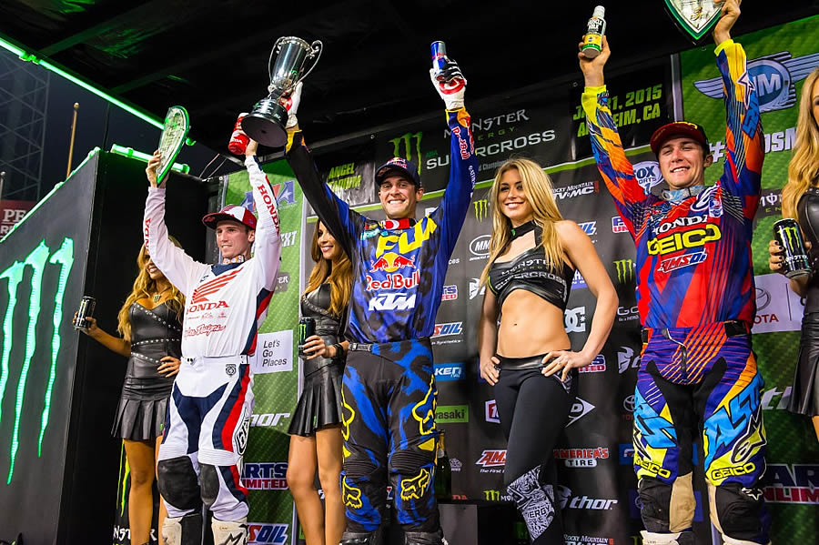 Troisième et dernier passage du championnat SX US dans le stade d’Anaheim et première victoire pour Ryan Dungey. Un podium inédit dans la catégorie reine avec Cole Seely et Eli Tomac aux côtés du leader du championnat sur un podium au pied duquel on retrouve Ken Roczen, désormais à 11 points de l’officiel KTM au classement provisoire.