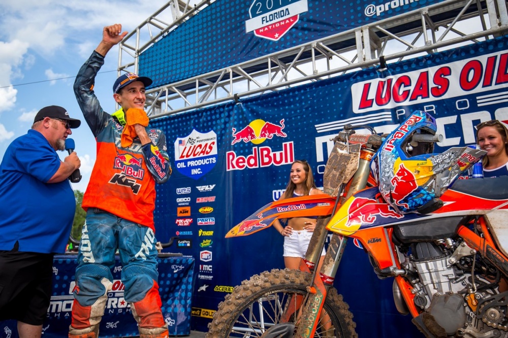 Avec une victoire en première manche puis une troisième place dans la seconde, Marvin Musquin a profité de la 5ème épreuve de la saison outdoor US à Jacksonville pour signer sa première victoire de la saison. Eli Tomac (7+1) et Zach Osborne (5+2) l’accompagnent sur le podium.