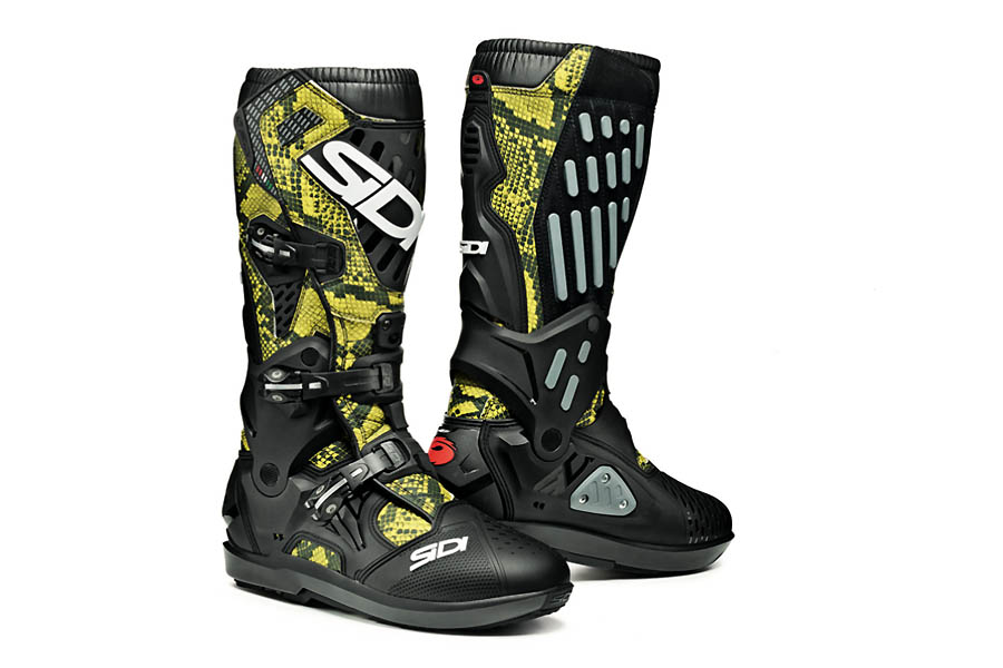 Lancée courant 2018, la botte Sidi ATOJO a rejoint la gamme du fabricant italien SIDI, le nom de ce modèle est l’acronyme de trois pilotes, deux italiens et un espagnol : Alessandro Lupino, Tony Cairoli et Jorge Prado. Coutumière de la personnalisation et des séries spéciales, SIDI présente pour célébrer les 60 ans des débuts de Dino Signori le fondateur et toujours propriétaire de la marque, un coloris collector Yellow Snake. Ce modèle est proposé en série limitée au prix de 509 euros. Il se distingue par un revêtement dont le design reprend l’aspect d’une peau de python jaune, célébrant ainsi les matériaux et les couleurs des années 60.