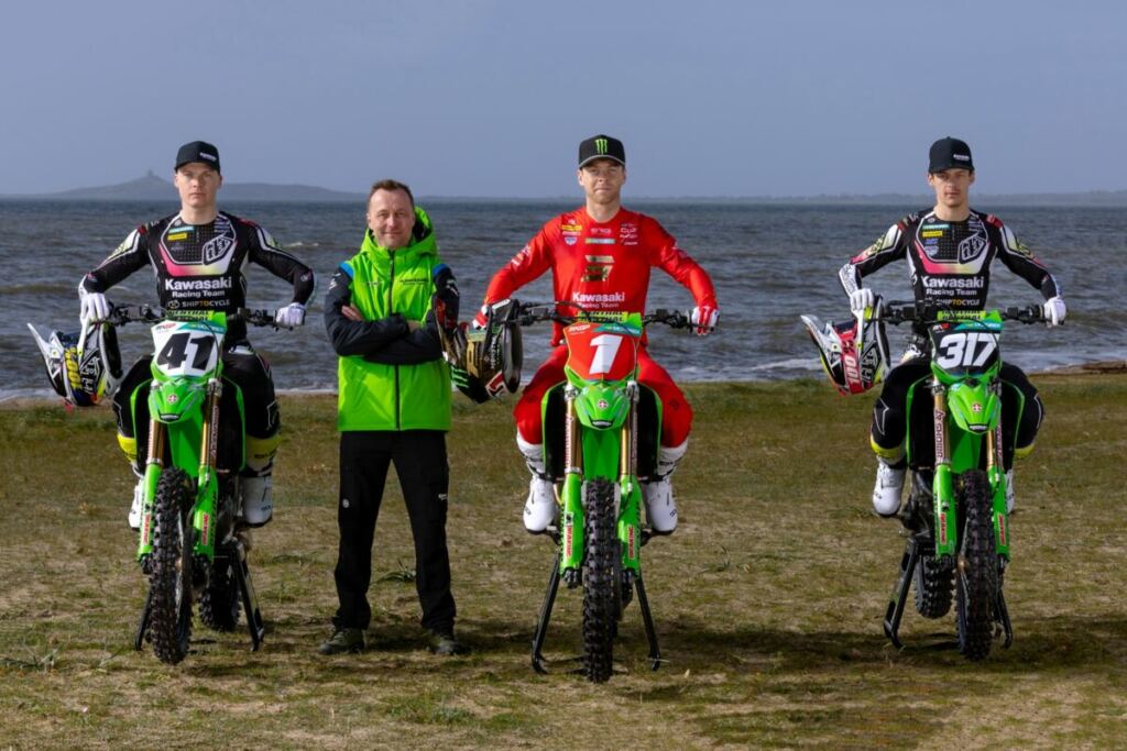 Avec le champion du monde MXGP en titre Romain Febvre épaulé par l’ancien champion du monde MX2 Pauls Jonass dans la catégorie reine et le prometteur Mathis Valin dans la classe MX2, Kawasaki aborde la saison 2026 armé jusqu’aux dents. Les Verts viennent de dévoiler les premières images de leurs pilotes et de leurs machines sous leurs couleurs 2026.
